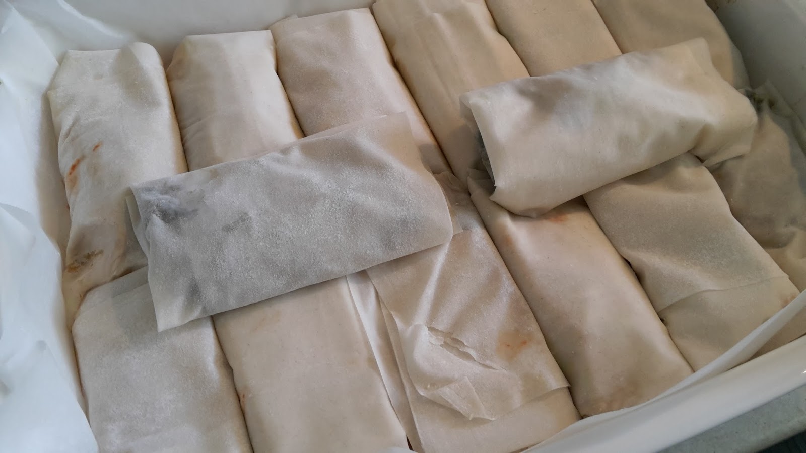 i fogli di pasta fillo sono grandi ed ho preferito tagliarli a metà, mettiamo all'interno le due farcie e chiudiamo ,sovrapponendo i lembi e poi richiudendo su se stesso il cannellone